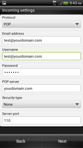 Add your incoming mail settings. This will be your full email address, your username which is also your full email address, and your password. Your imap or pop server would be mail.domain.tld, replacing domain.tld with the customers actual domain. Security would be none and port should stay at the default.