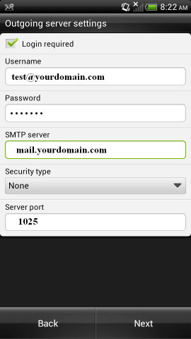 Your outgoing settings will be essentially the same as your incoming settings. Make sure you click "login required" on the top "security type" can stay as "none" and port should be changed to 1025.